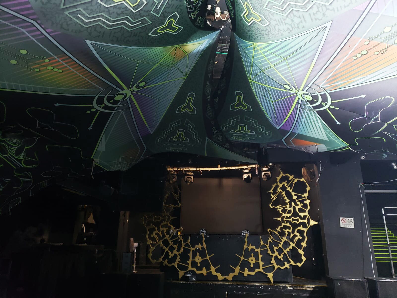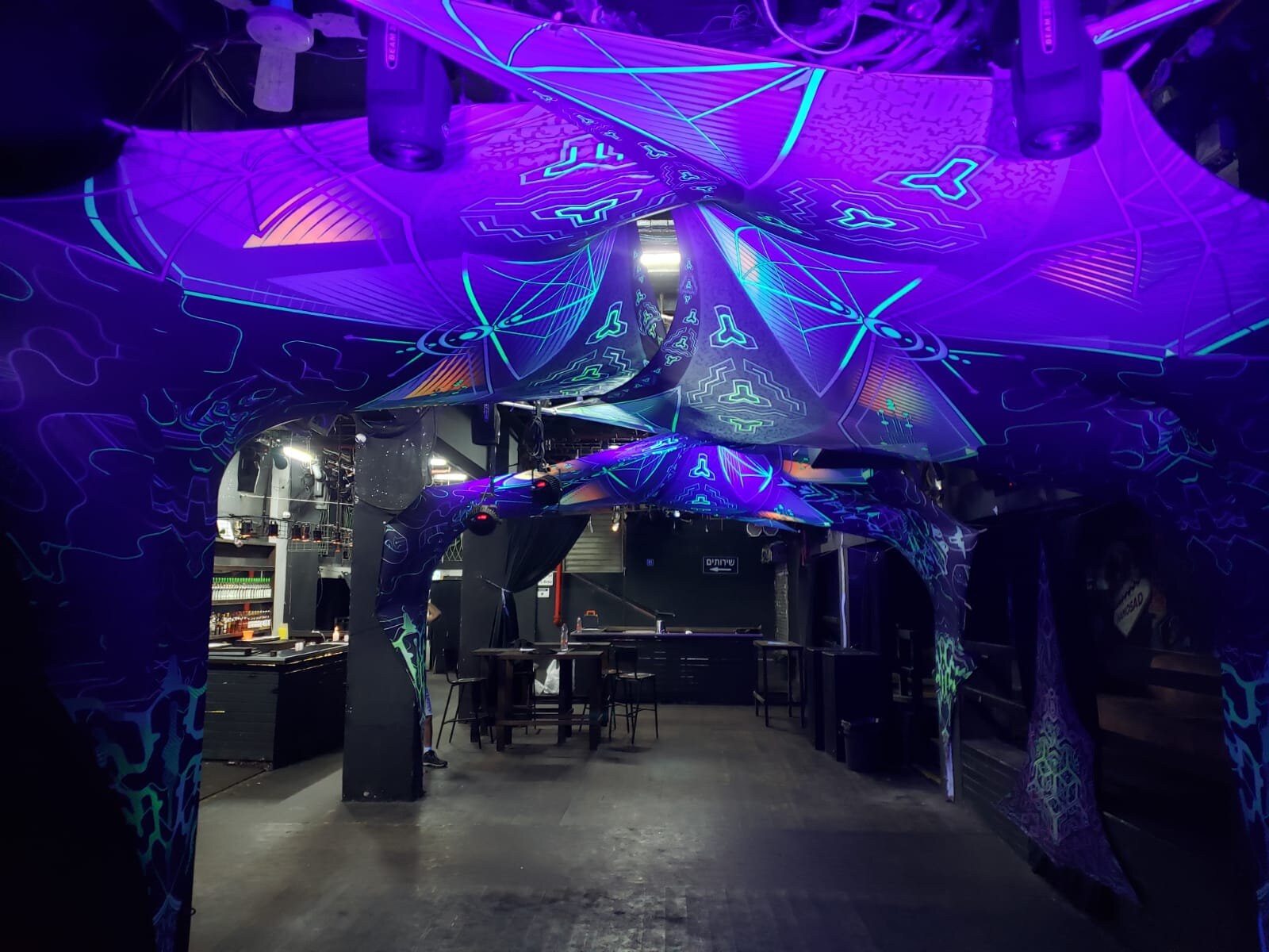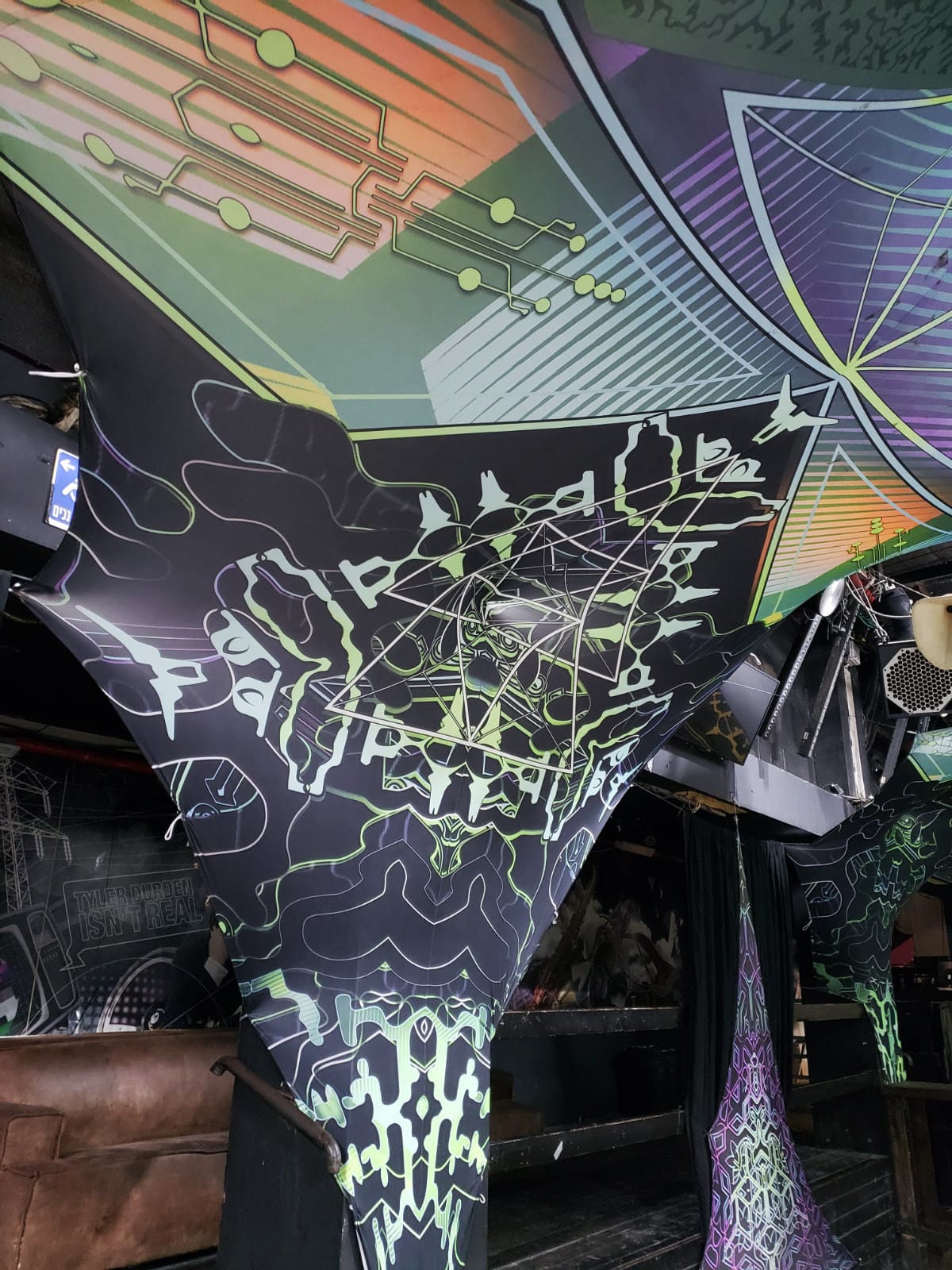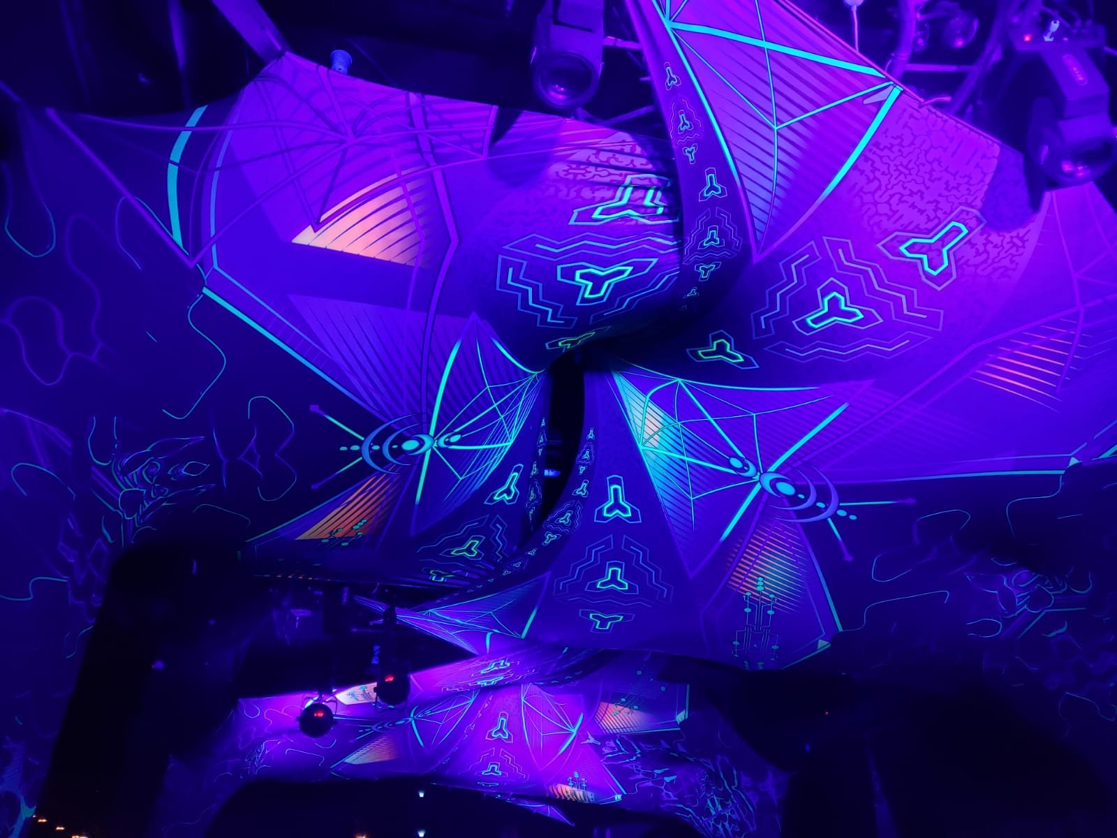 16x16m UV-Reactive Festival canopy Ceiling Decor – Shipibo Conibo – Psychedelic Glow tent Trippy installation art Lycra Blacklight PsyTrance