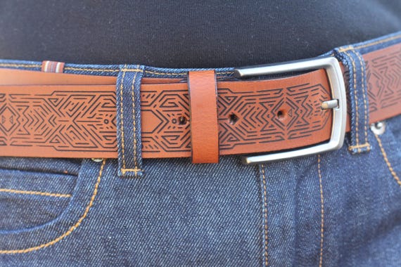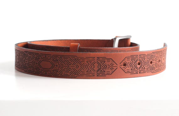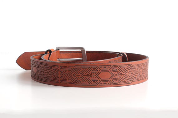 Leather Belt with Laser Engraved Geometric Geometric Art Deco Pattern