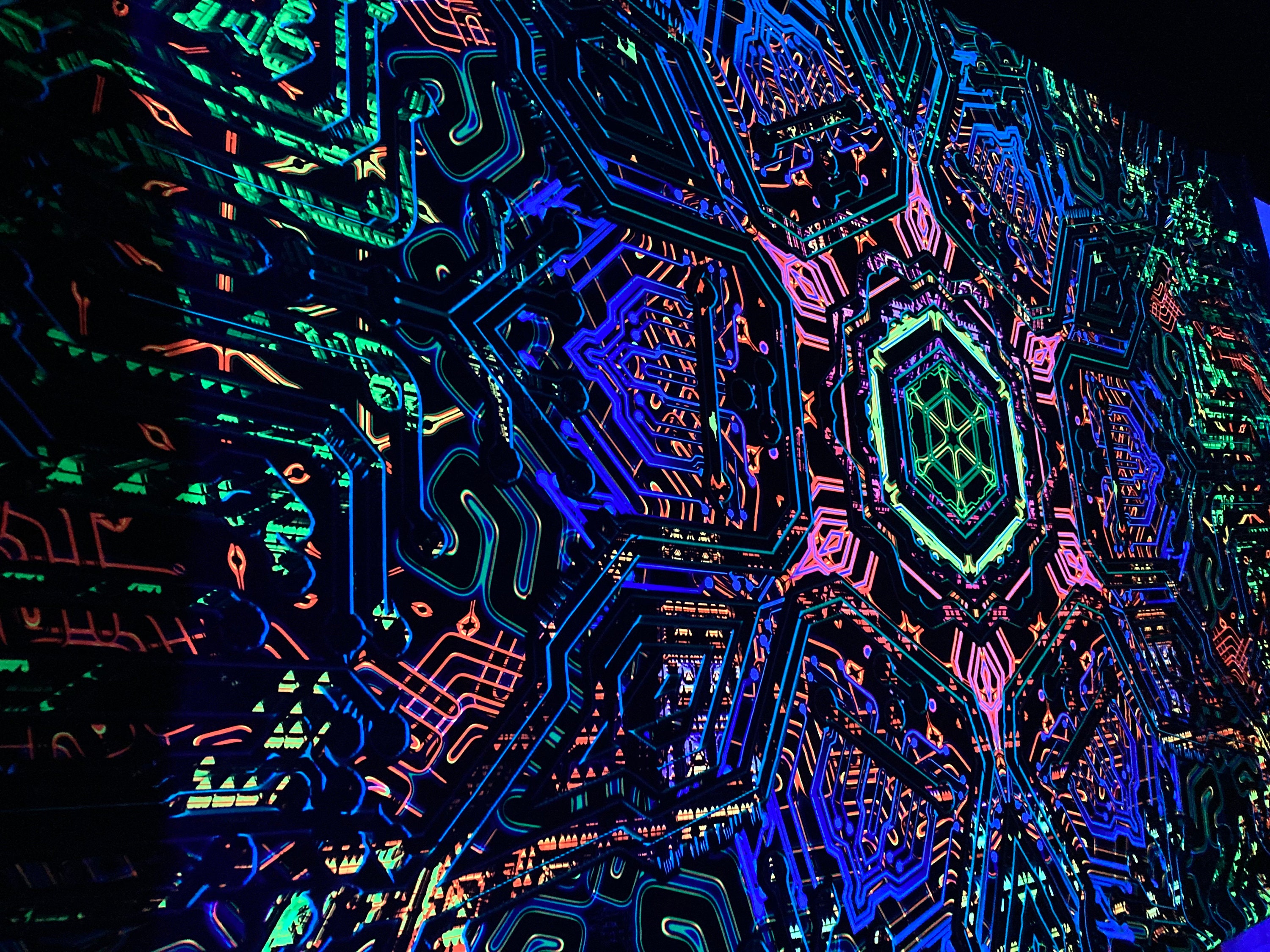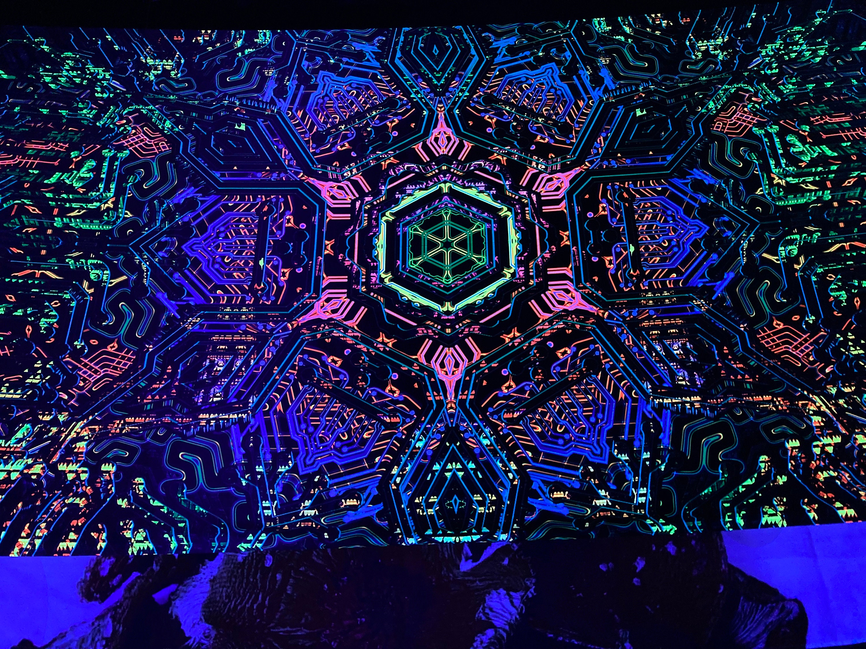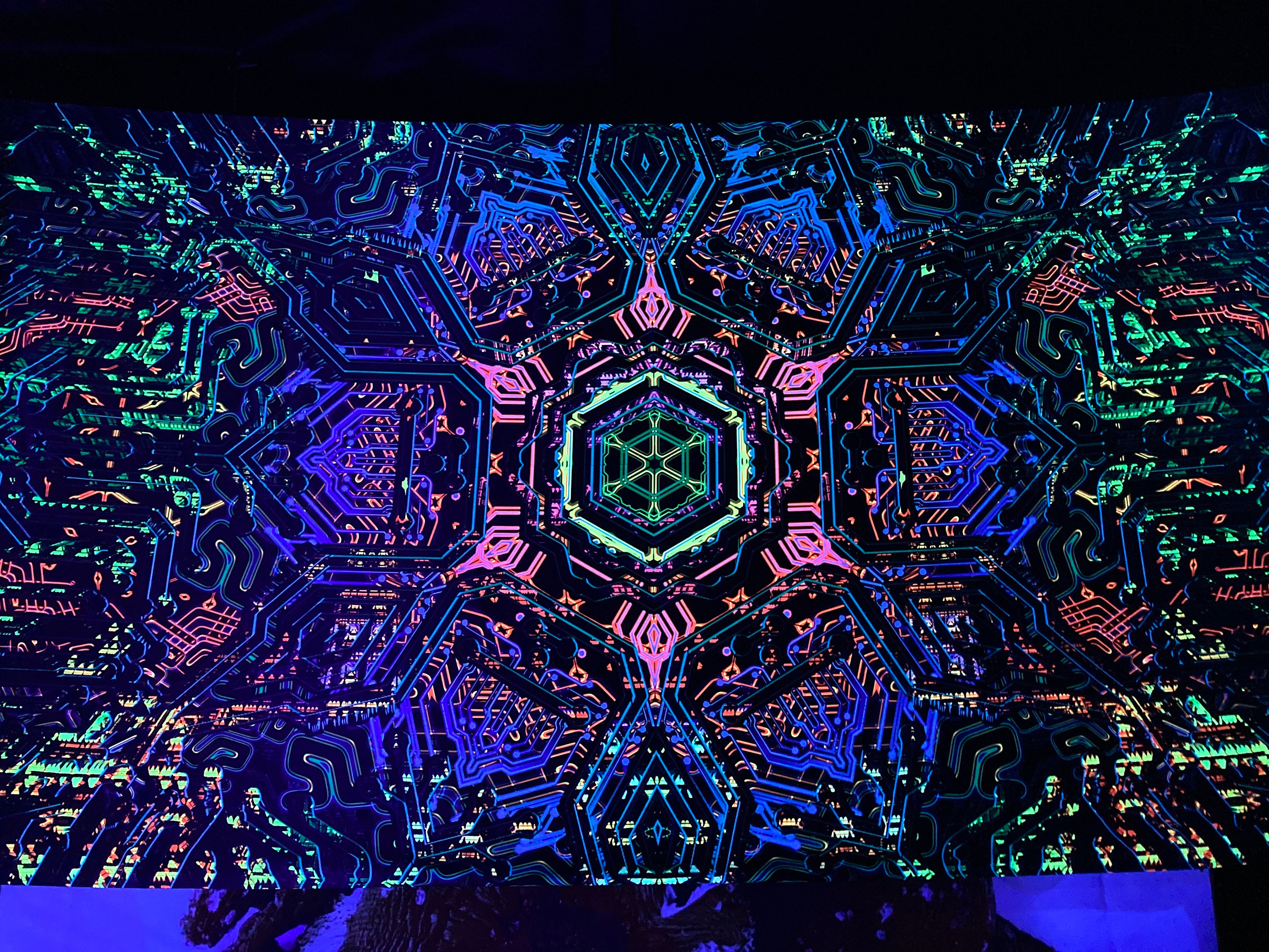 🔱 SACRALIS (2022) UV psychedelic art, fluorescent lycra tapestry