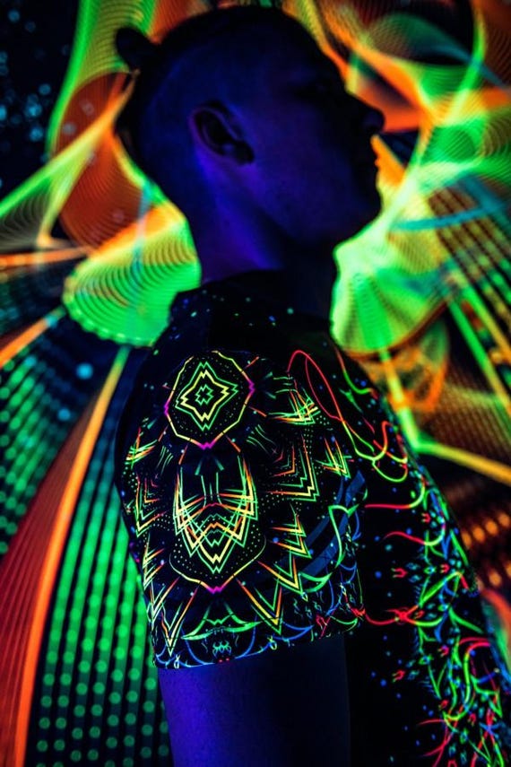 Blacklight Psychedelic and Neon Ultraviolet Active T-shirt “Crystal Wizard” for Men and Unisex, Psytrance Goa Party