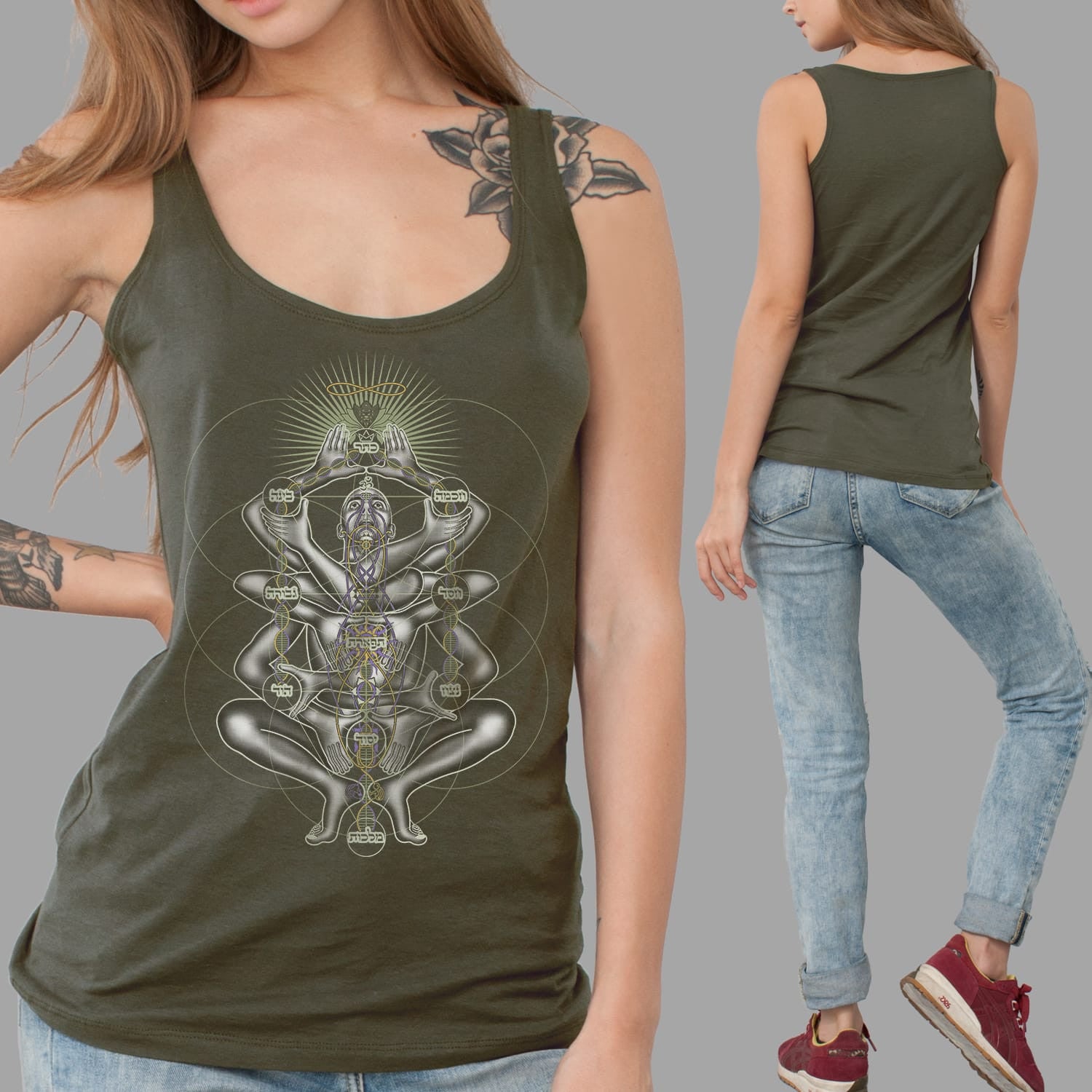 Tags: graphic illustration, style front print, Color_Olive, artwork dance like a tree, iconic, kabbalah, Sacred Geometry, symbolism, Collection_Women Tank Top