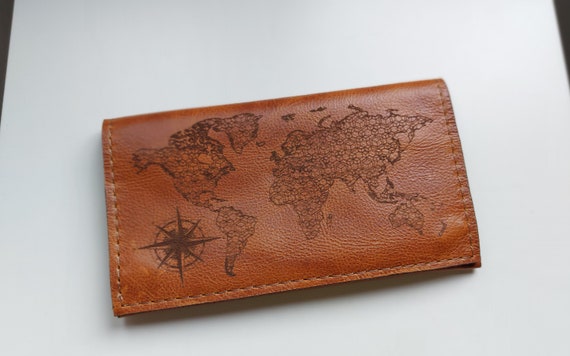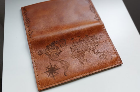 It is made from genuine leather (Greek cow leather), which has been vegetable tanned. It has laser etched World Map and a compass (so you will always find your way ;-)) on the outside and some geometric patterns inside. The image is burnt like in pyrography, so it will stay forever. The stitches are made with strong, unbreakable thread for leather products.