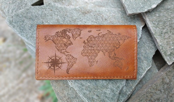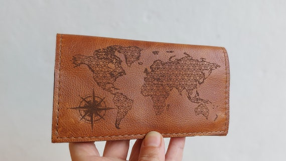 Engraved World Map Leather Tobacco Pouch, Rolling Cigarettes Case