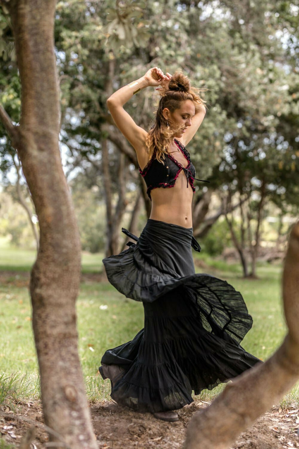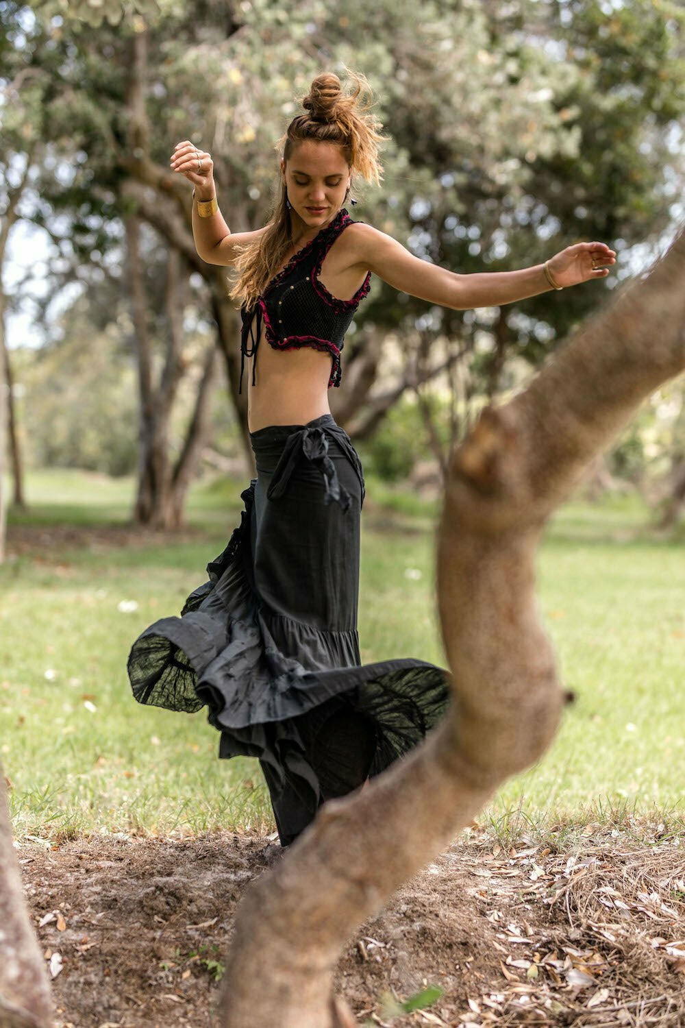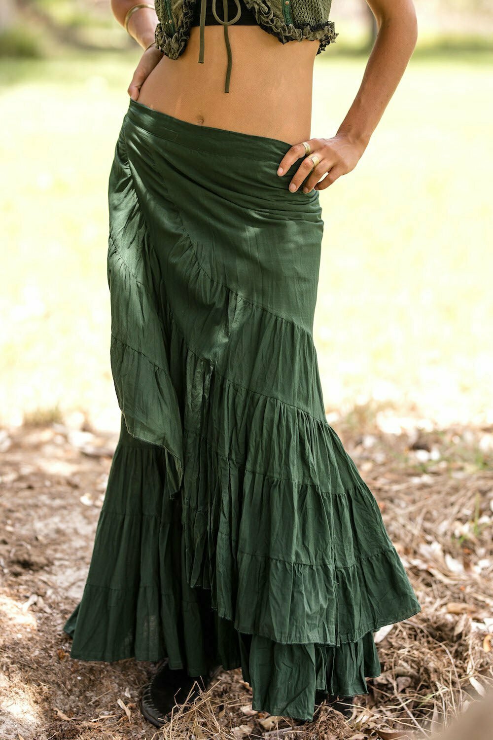 This naturally flowing piece is a 100% cotton wrap around One Size Fits All skirt that will have you dancing and twirling all night long!