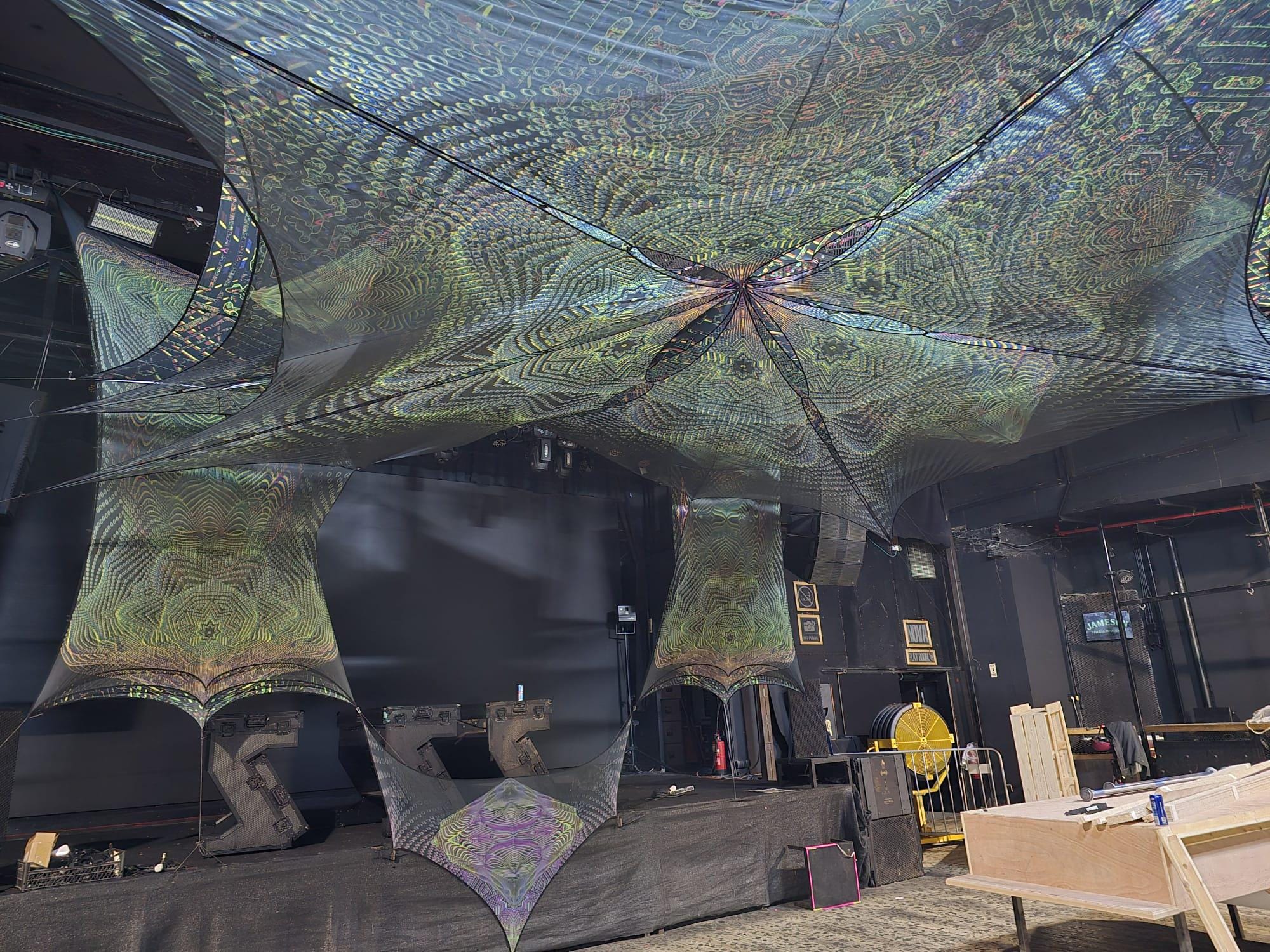 Fluorescent Festival Canopy Set – Psychedelic Ceiling Tapestries in Lycra & Mesh, UV DJ Booth Trippy Decoration