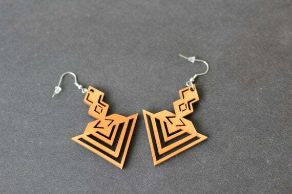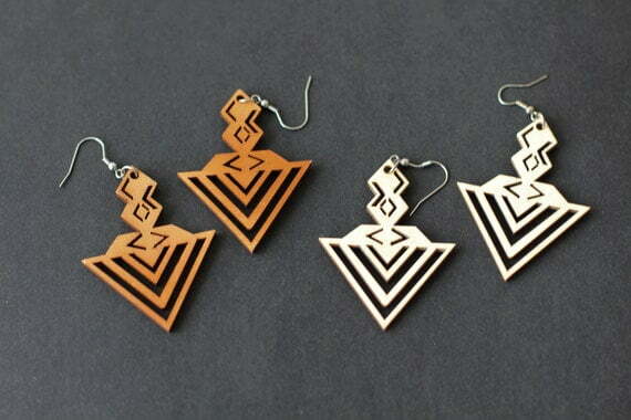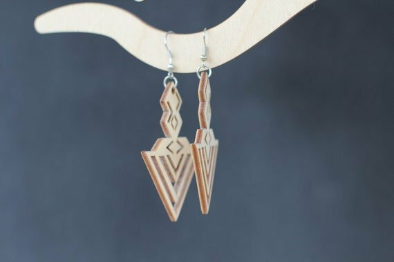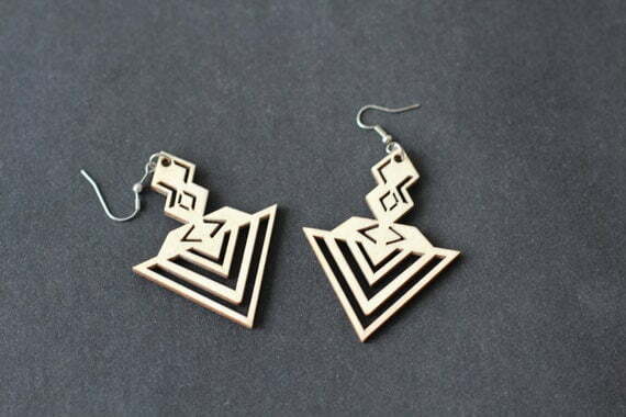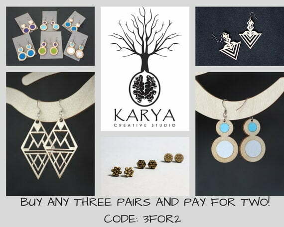 The pair is laser cut from 3mm birch plywood. It was carefully cleaned (as laser leaves burnt marks) and varnished to protect from humidity and prevent from staining on the skin. It closes with stainless steel French hook. It is very light and easy to wear.