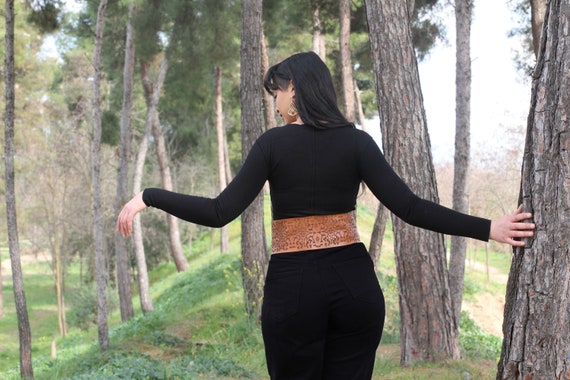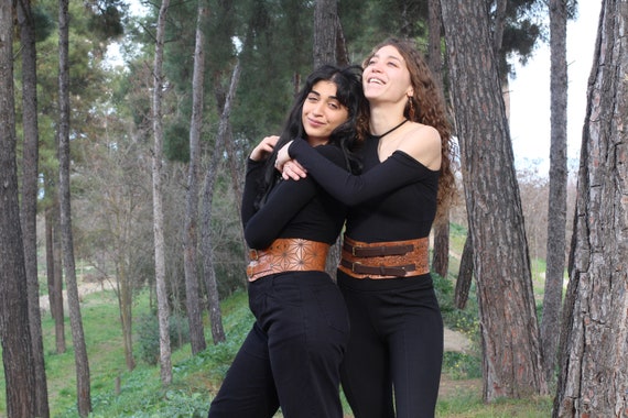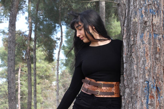 * Unique design: Made from full grain cow leather this brown corset style belt will elevate your style! To create it we have used cognac brown leather with engraved Shipibo pattern and combined it with dark brown leather closure. Brass buckles and snaps add to its beauty and originality.