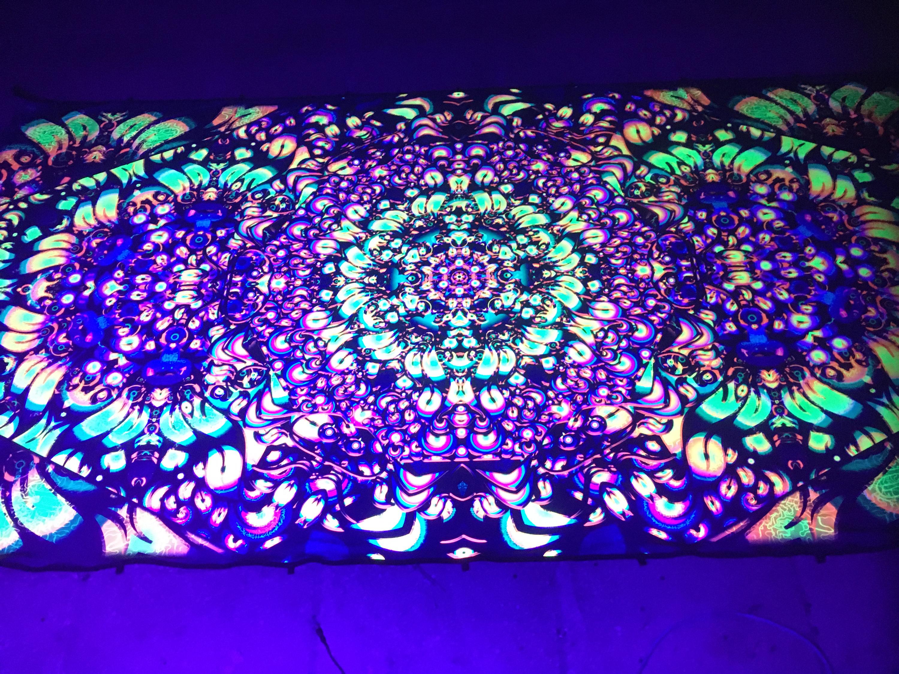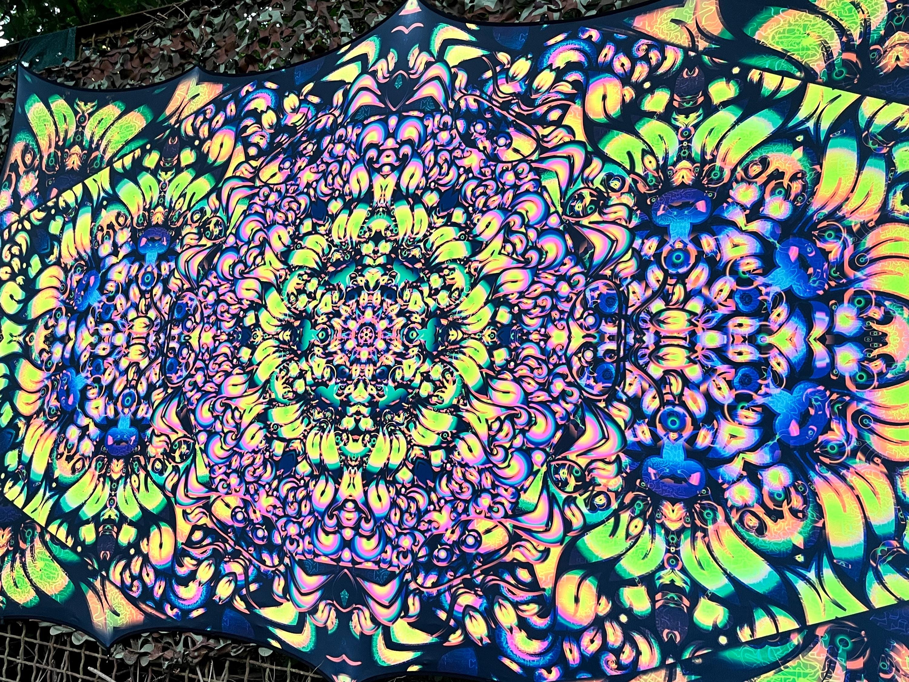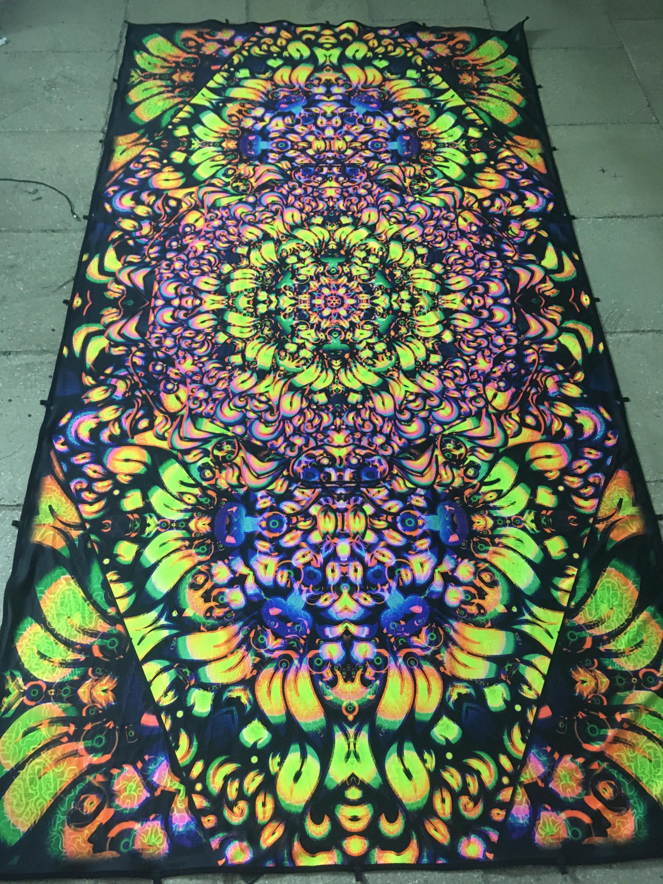 We specialize in Blacklight Tapestry, extra large wall art, Psychedelic art, outdoor party decor, psychedelic poster, flower dj stage, DJ Booth, UV Psychedelic Backdrop, party decorations, ceiling decor, modern decor, neon tapestry, trippy art, surreal art, sacred geometry art, party decor, neon sign art, Spiritual Art, wall art prints, textile art, psy artwork, etc.