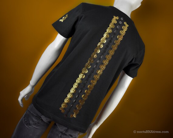 Classic T-shirt with the Metalic Sacred Geometry print from the “Light Star” series. The whole decoration made by our hands using the FLEX technology,. Three colors of a special material were used for decoration: elegant black matt, old silver and dazzling gold. The whole gives the shirt an exclusive character and the metallic finish shimmers amazingly in the light.