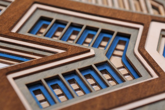 This beautiful piece is made from 6 layers of plywood which was hand stained into different colours (natural wood, blue, dark brown, grey, silver – all water based so you can see the natural wood’s grain) to highlight the complexity and the depth of the design.