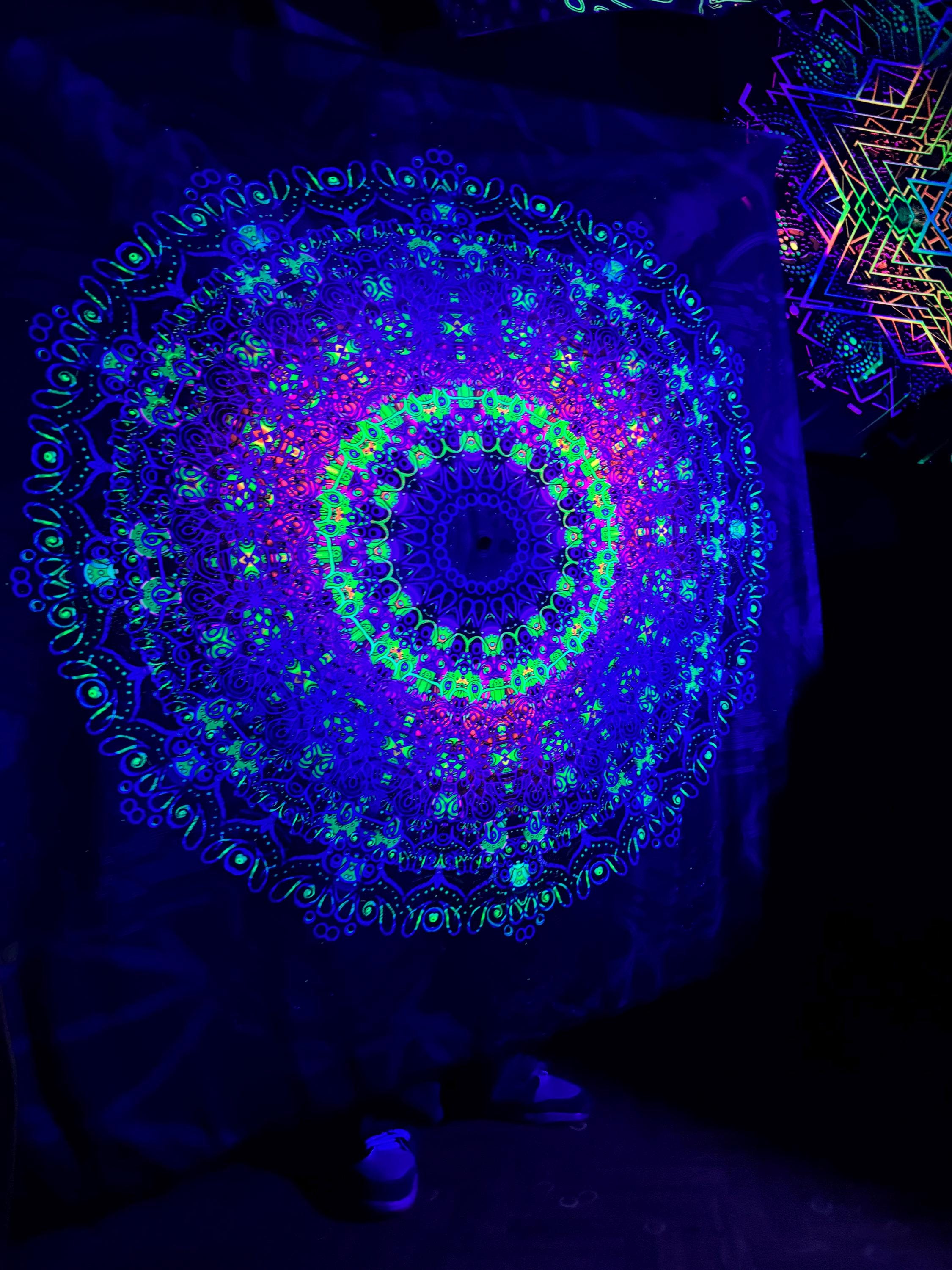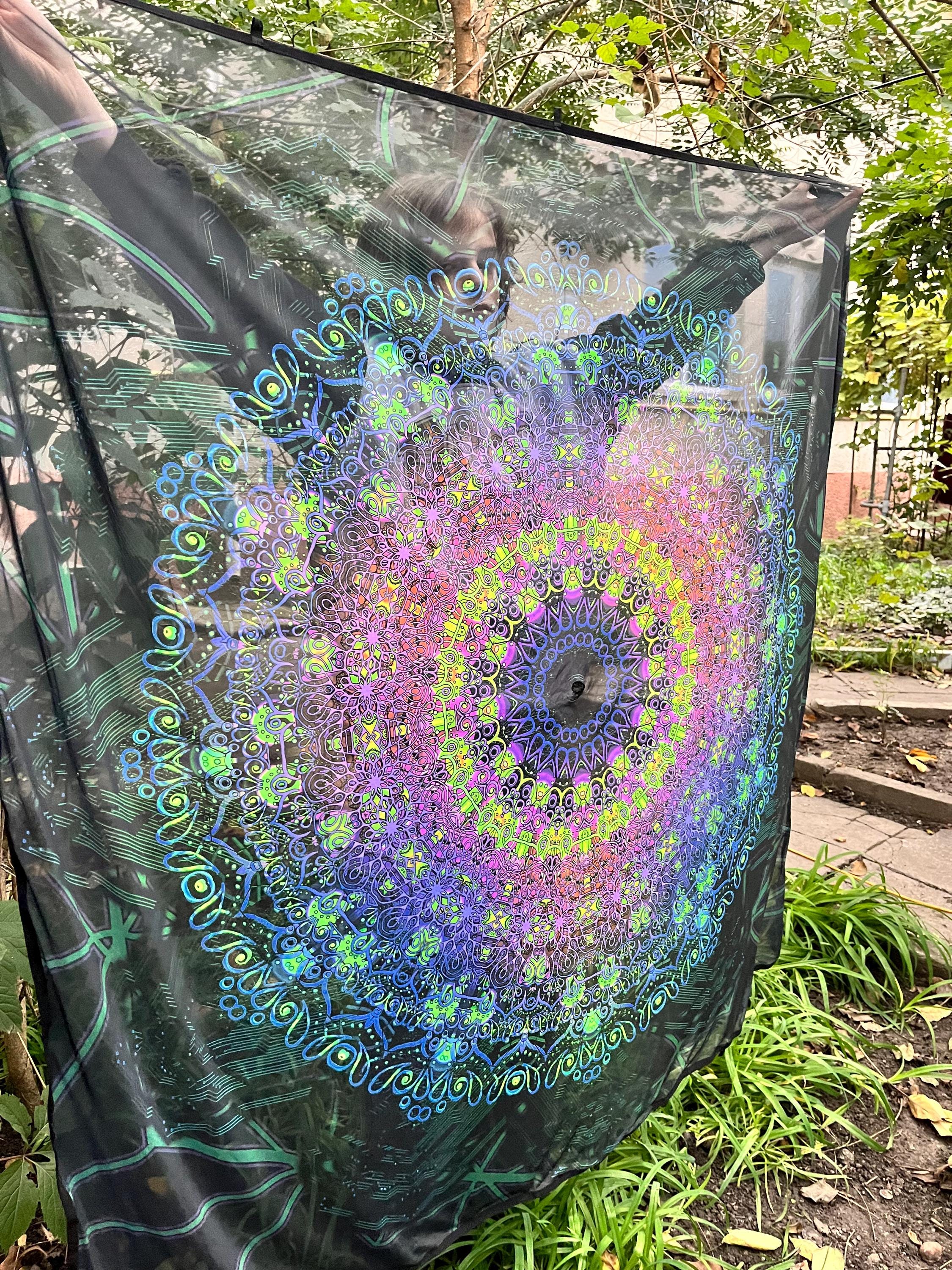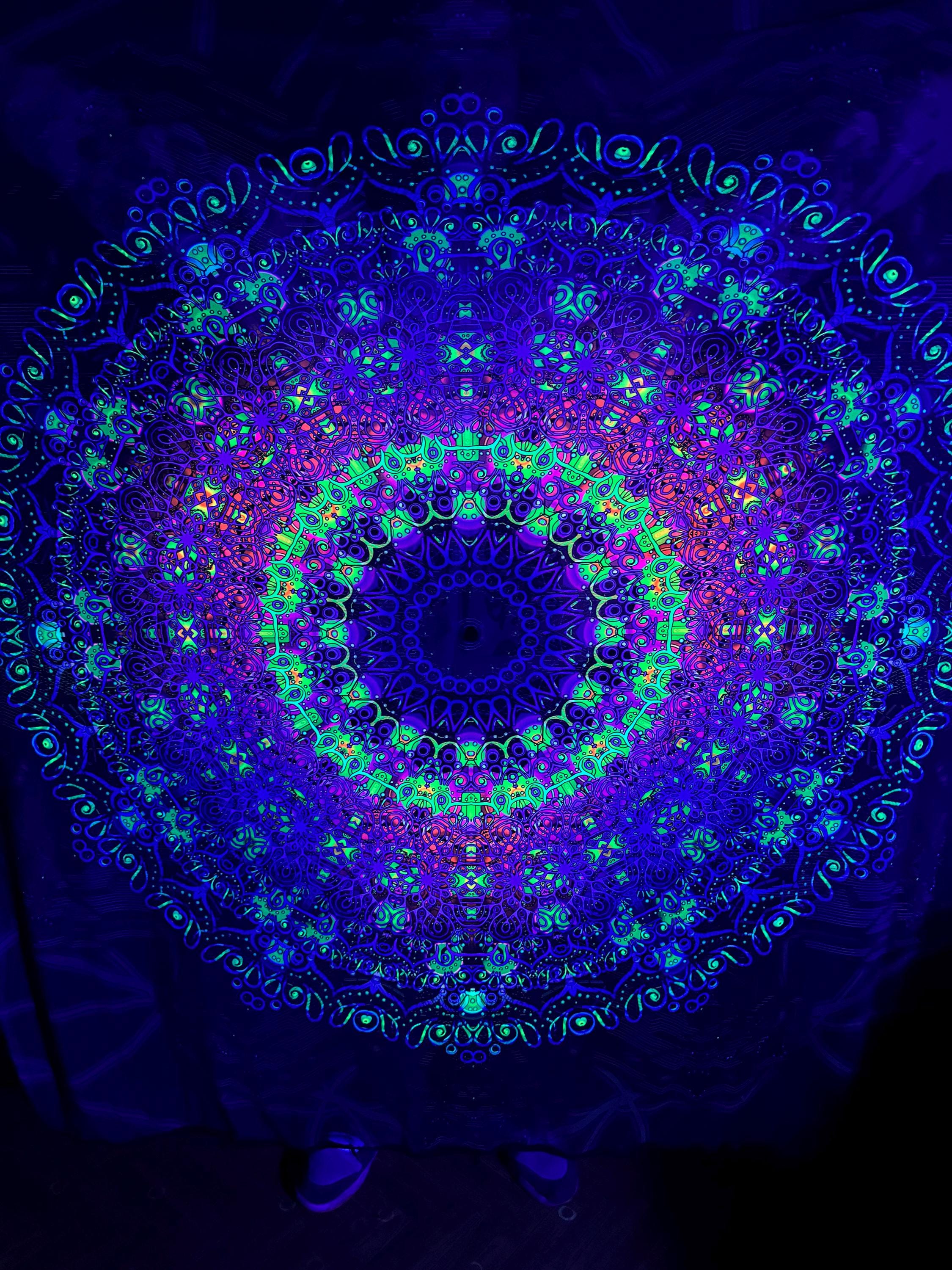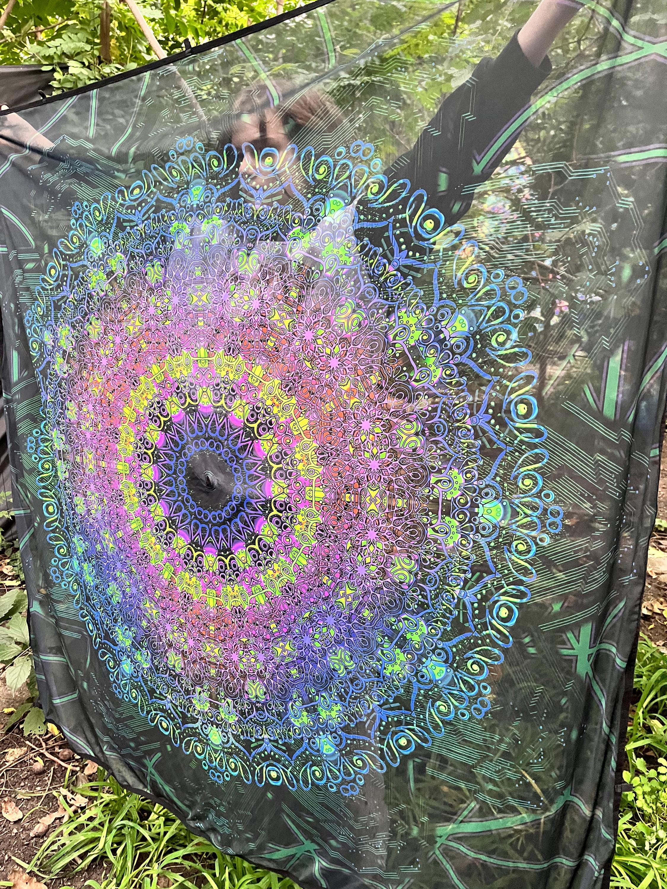 Psychedelic Mandala Mesh Tapestry, 3D Trippy Art Blacklight Installation, UV Spiritual Decor