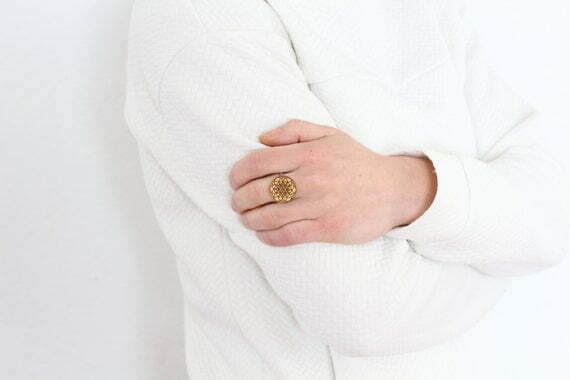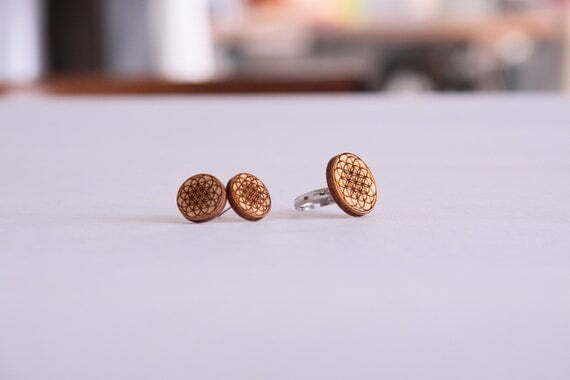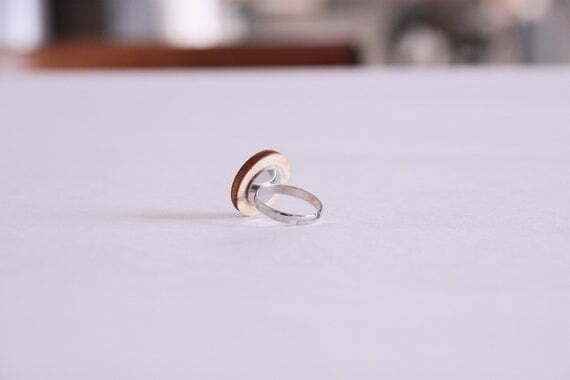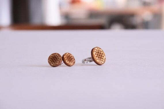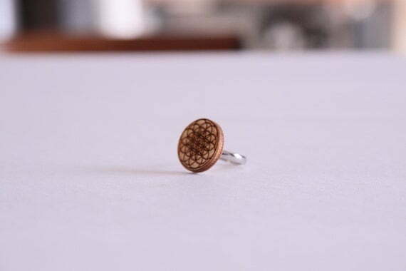 Ring. Stainless Steel Adjustable Ring With Wooden Laser Cut Head Featuring Flower of Life – Sacred Geometry Jewelry