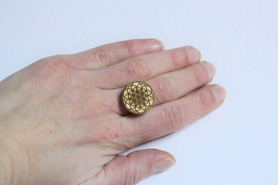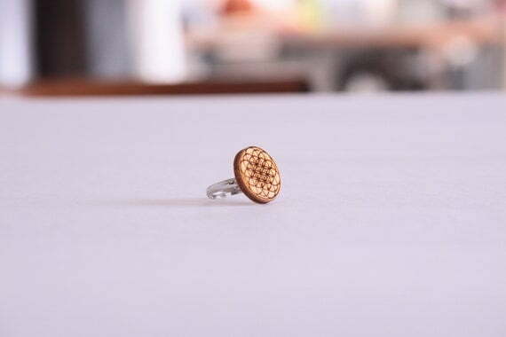 Ring. Stainless Steel Adjustable Ring With Wooden Laser Cut Head Featuring Flower of Life - Sacred Geometry Jewelry