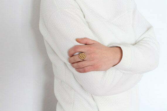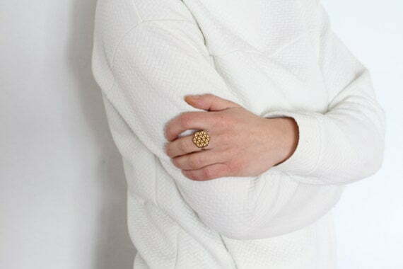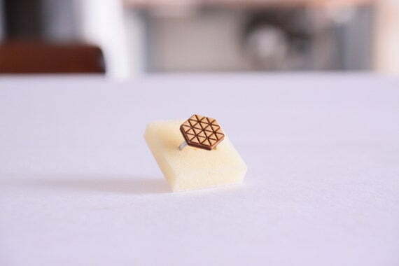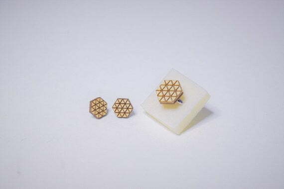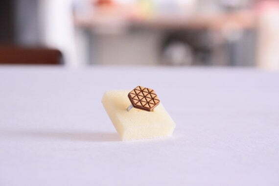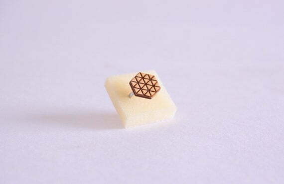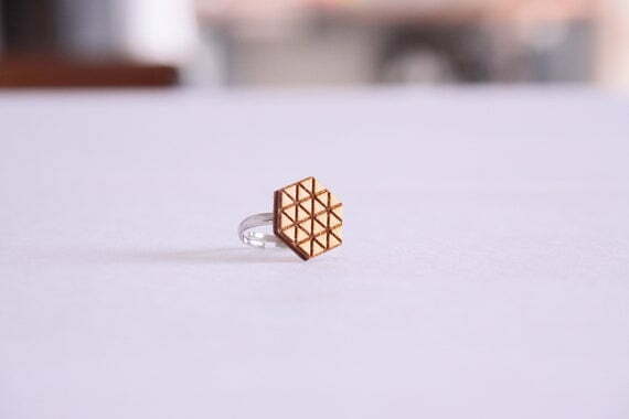 Ring. Stainless Steel Adjustable Ring With Wooden Laser Cut Hexagon Head Featuring Triangles – Sacred Geometry Jewelry