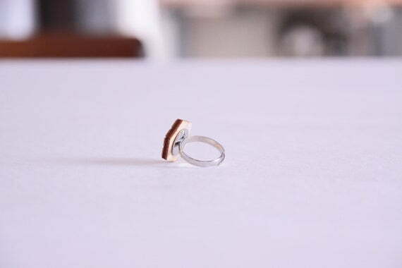 Ring. Stainless Steel Adjustable Ring With Wooden Laser Cut Hexagon Head Featuring Triangles - Sacred Geometry Jewelry