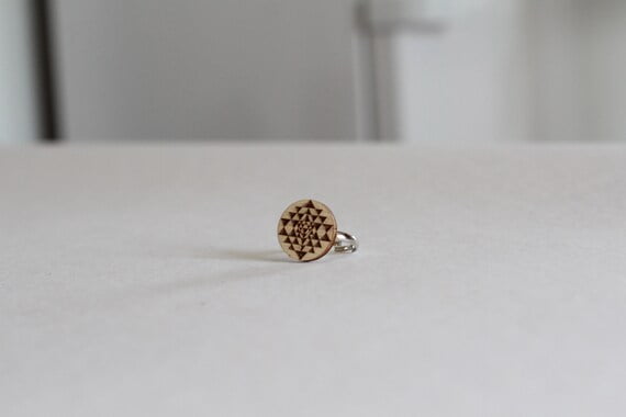 Ring. Stainless Steel and Laser Cut Wood Ring With Laser Etched Sri Yantra Symbol- Sacred Geometry Jewelry