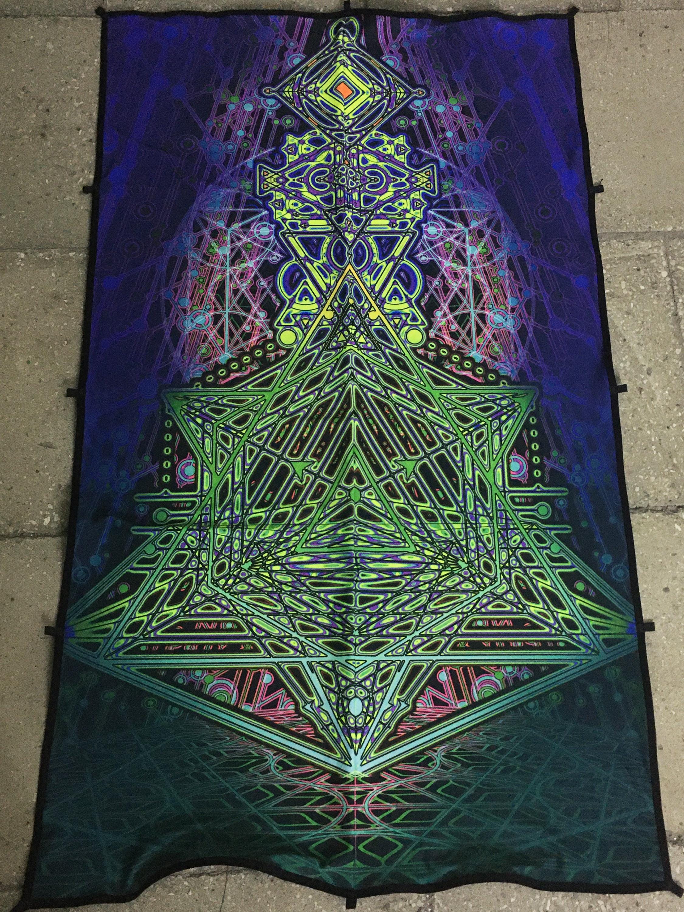 Sacred Geometry Blacklight Tapestry featuring a Neon Psychedelic Art Merkaba design!