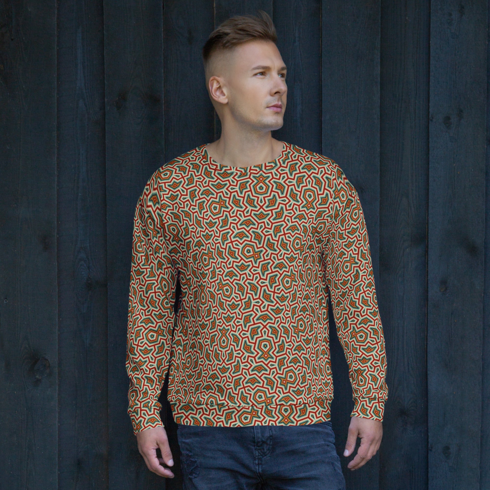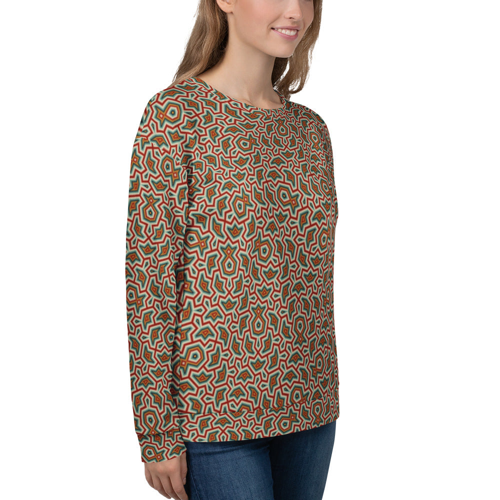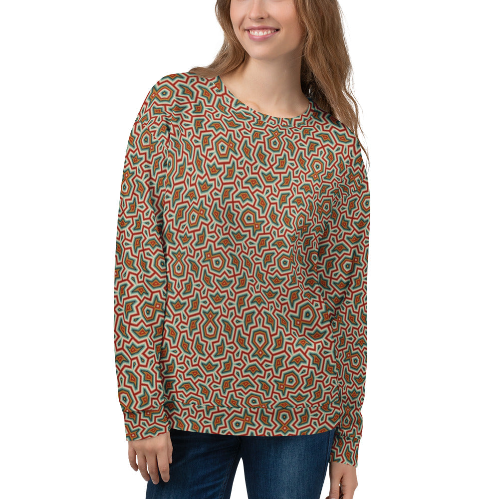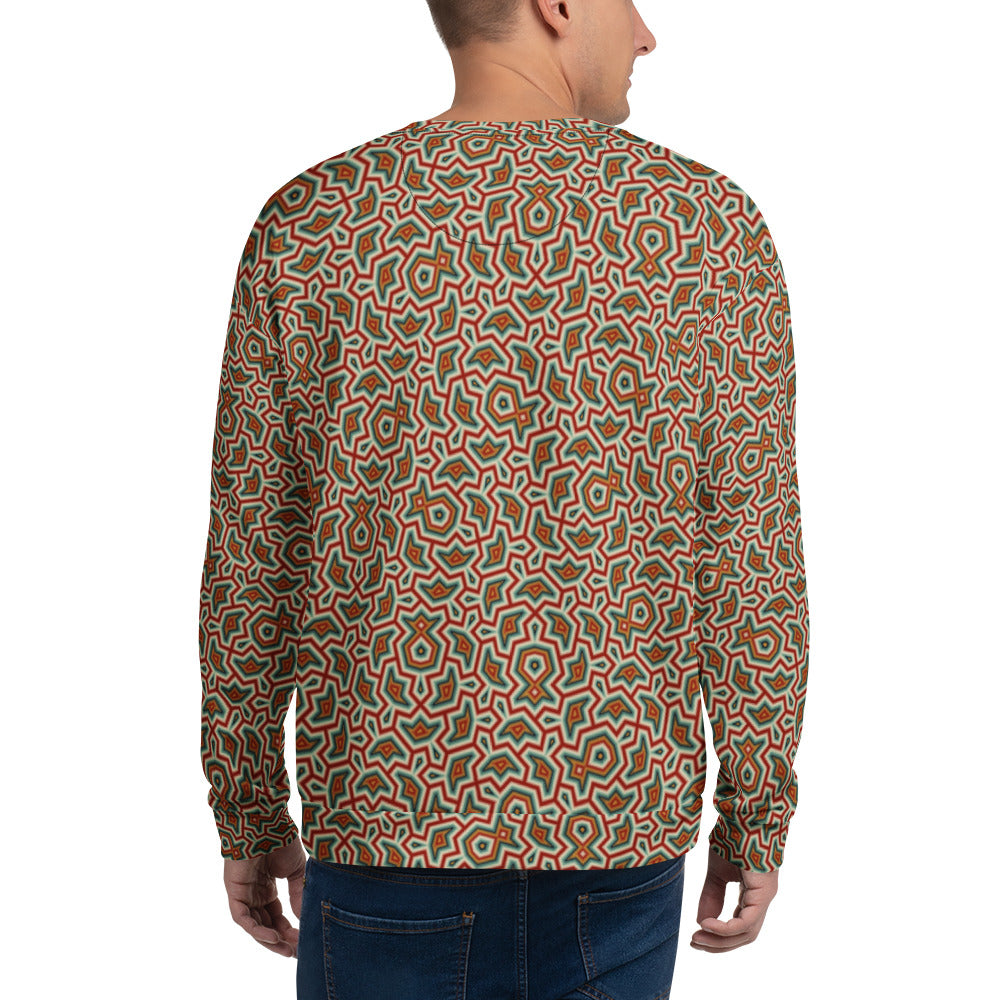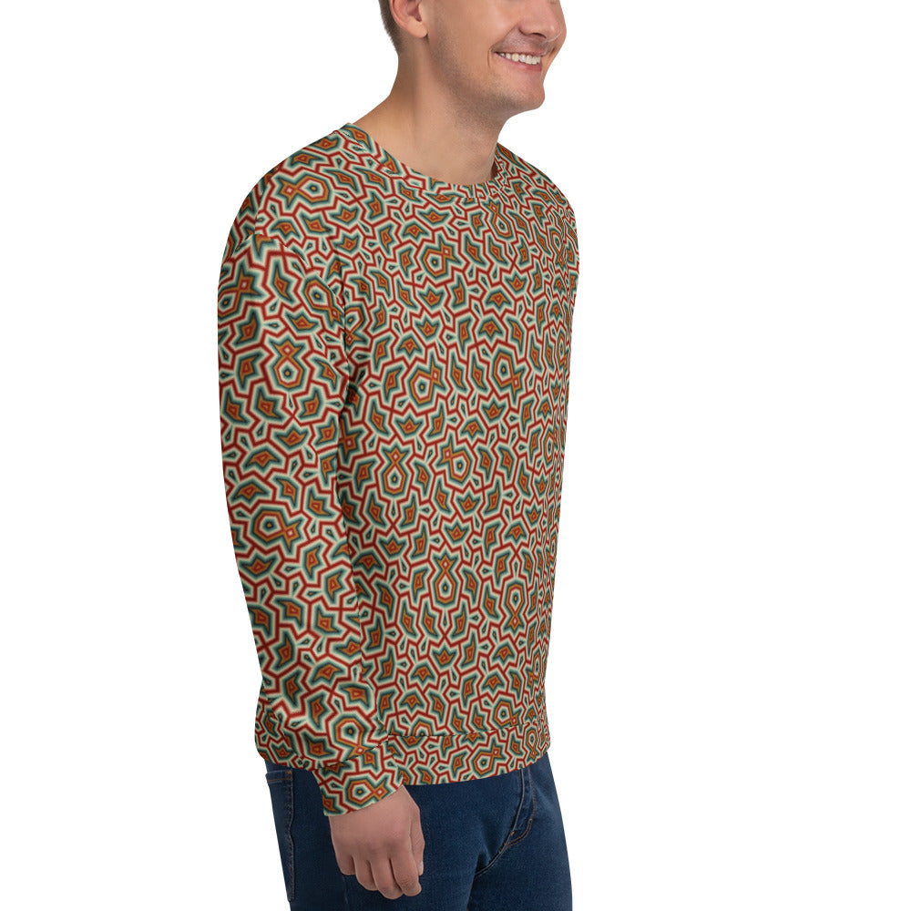 This unisex all-over print sweatshirt features a visionary geometric design inspired by the pineal gland and spiritual perception. Made with recycled fabric, *Pineal* merges inner awareness with outer expression—ideal for meditative vibes or bold daily wear.
