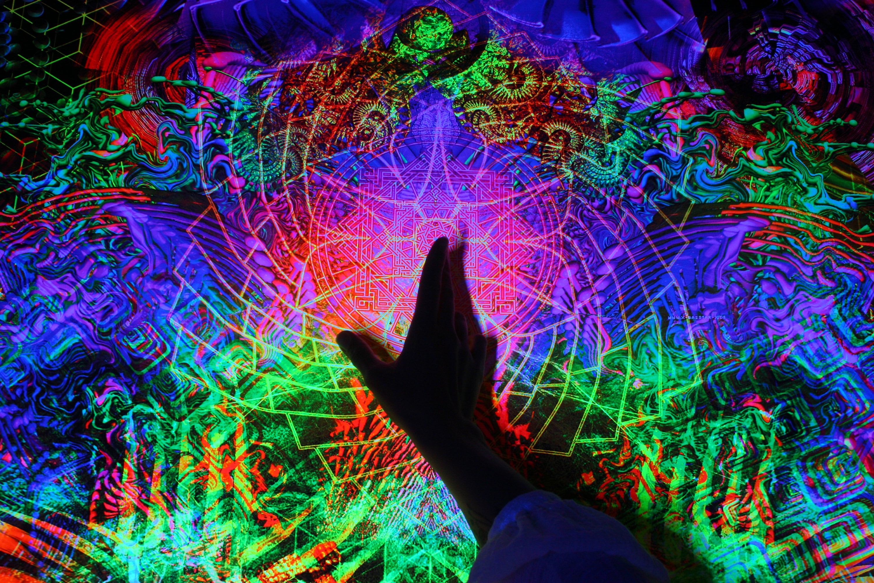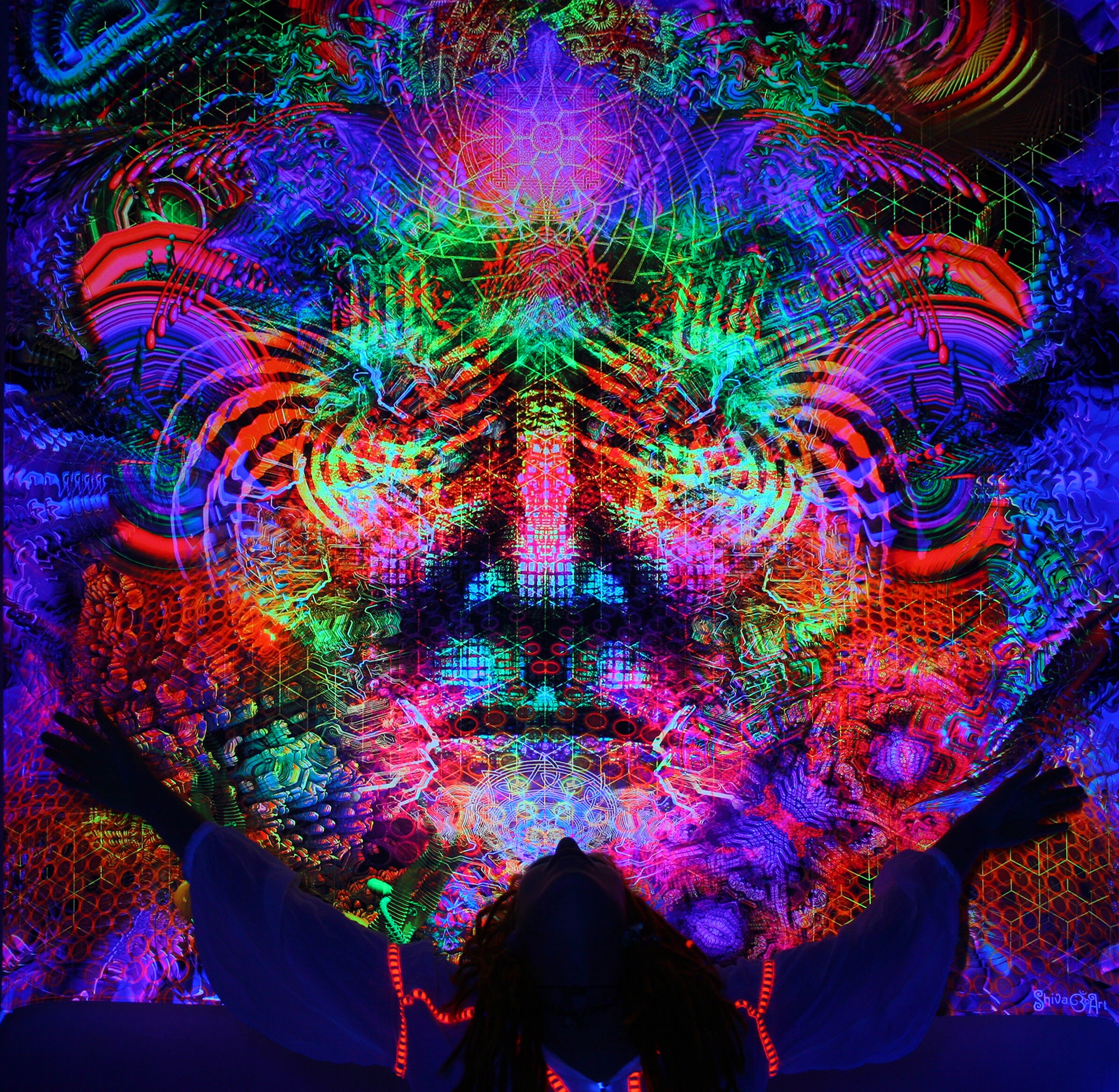 Uv backdrop, blacklight trippy tapestry, glow party, fabric poster, aesthetic tapestry, neon light, synth trippy art