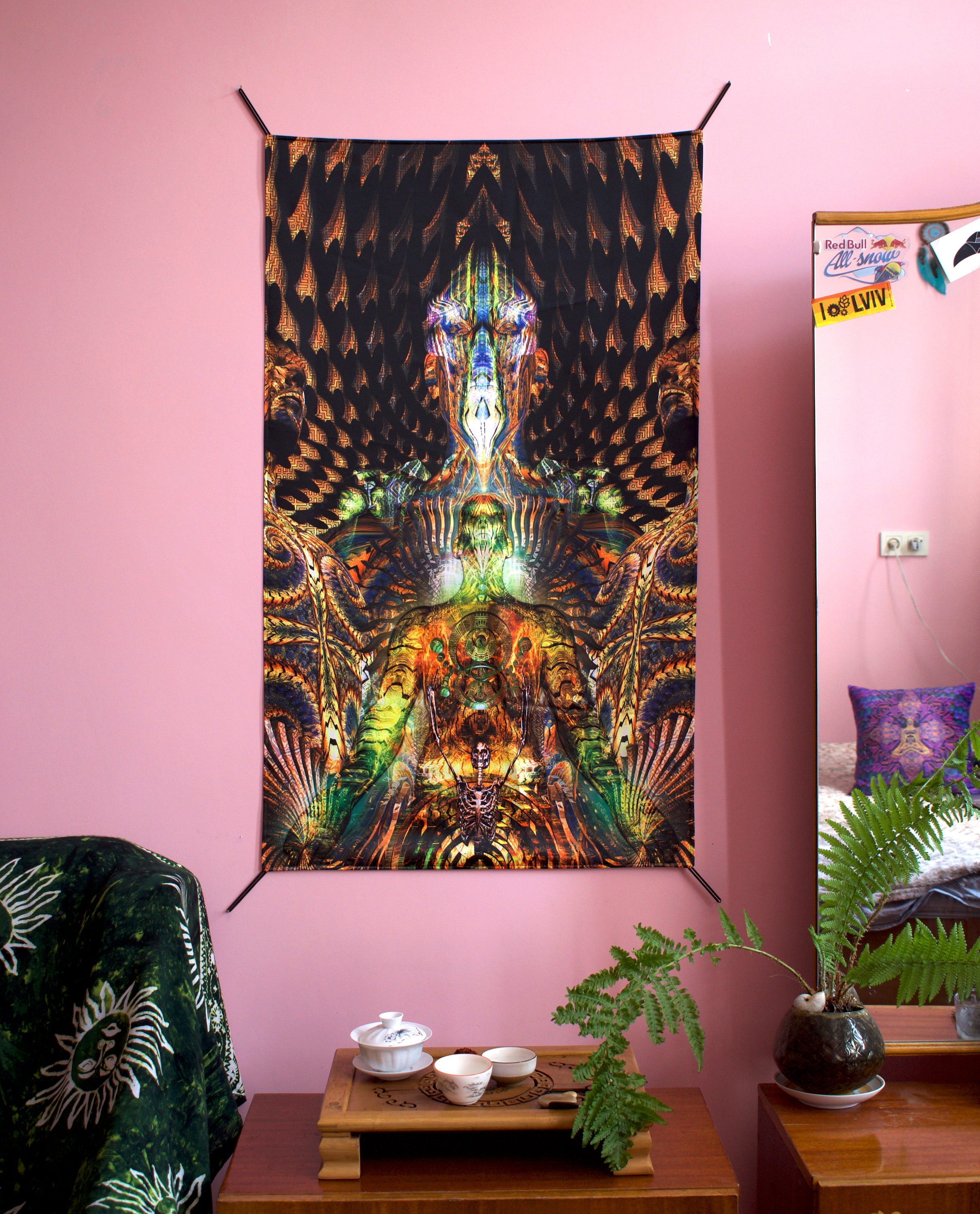 UV backdrop, uv tapestry, glow party, psychedelic poster, meditation room, futuristic visionary art, neon light
