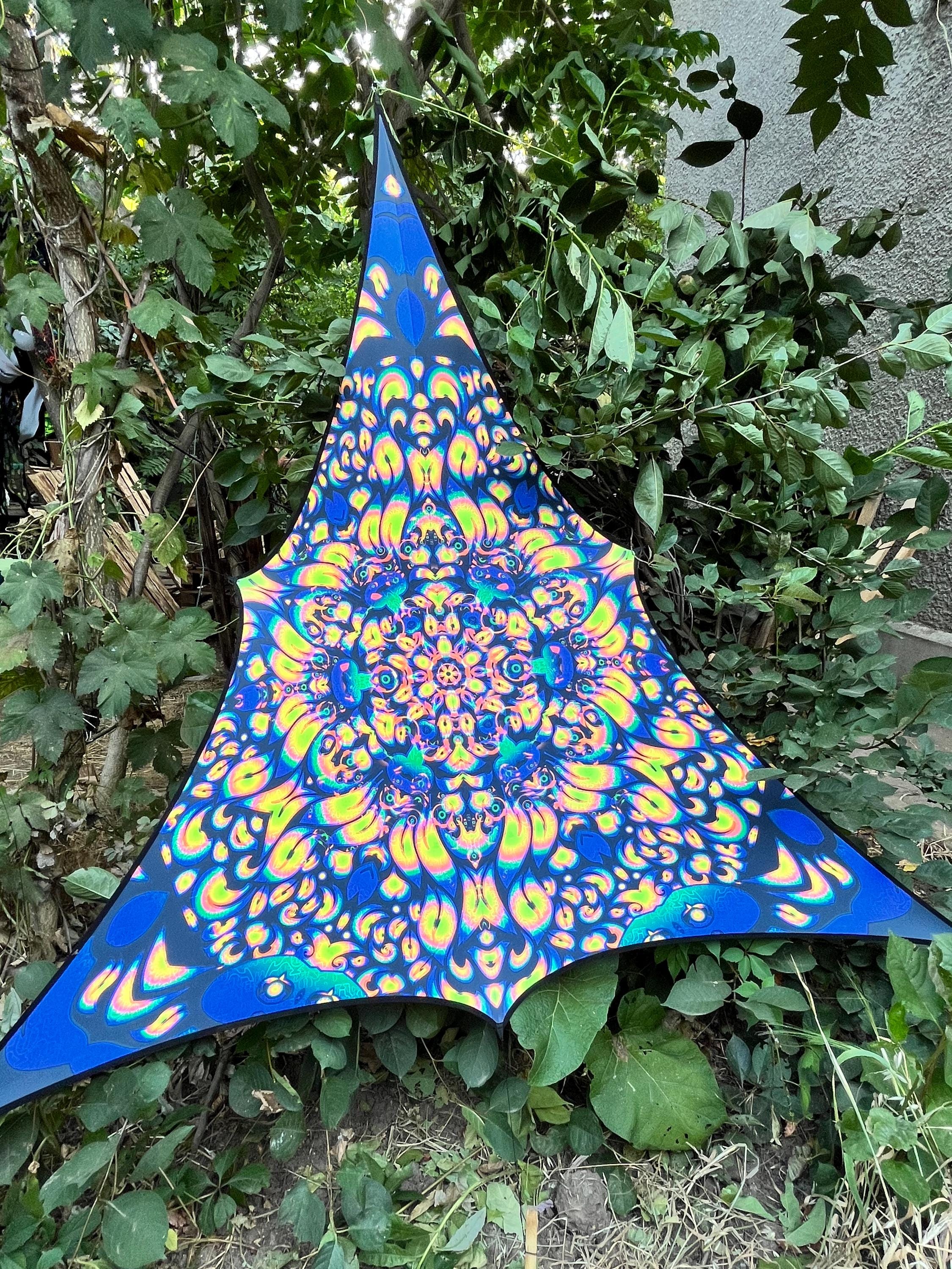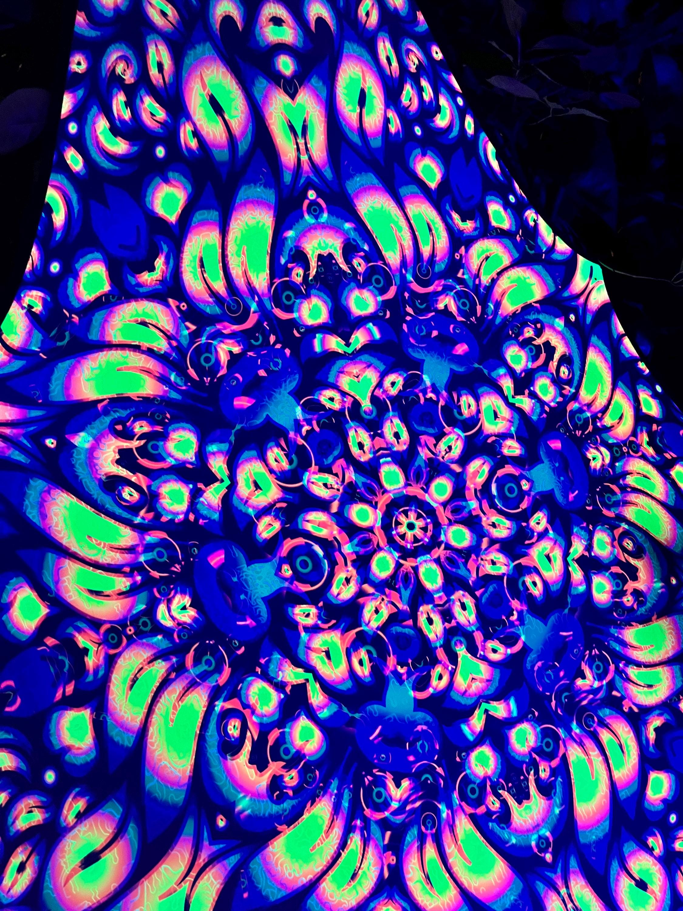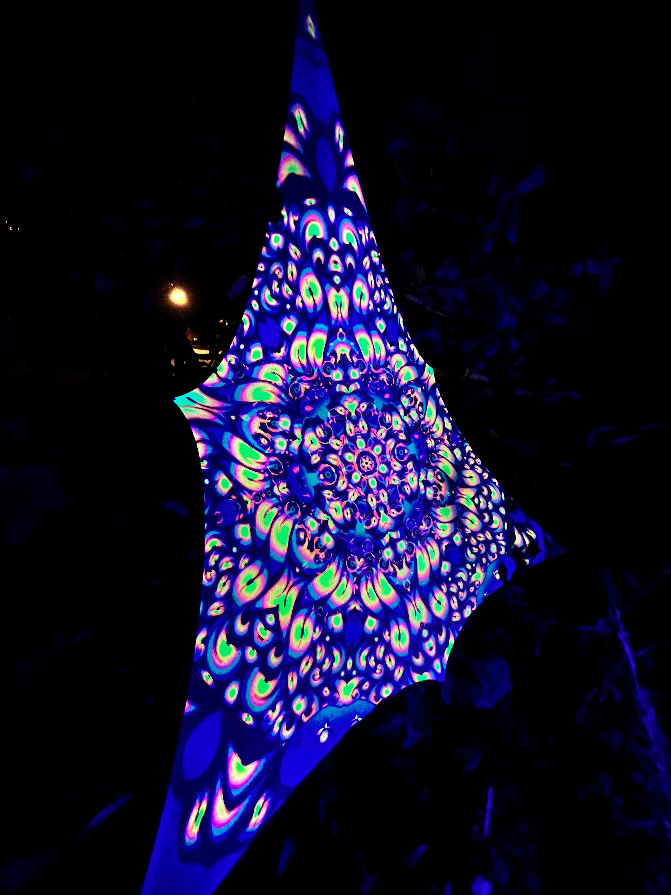 We specialize in rave accessories, uv psychedelic art, Merkaba, large tapestries, baldachin goa deco, fluorescent tapestry, psychedelic tapestry, aesthetic tapestry, Festival Canopy, trippy ceiling decor, abstract wall decor, sacred geometry, party decorations, glow in the dark, blacklight canopy, neon sign art, DJ stage, DJ booth, psychedelic canopy, blacklight art, festival outfit, spiritual gifts, etc.