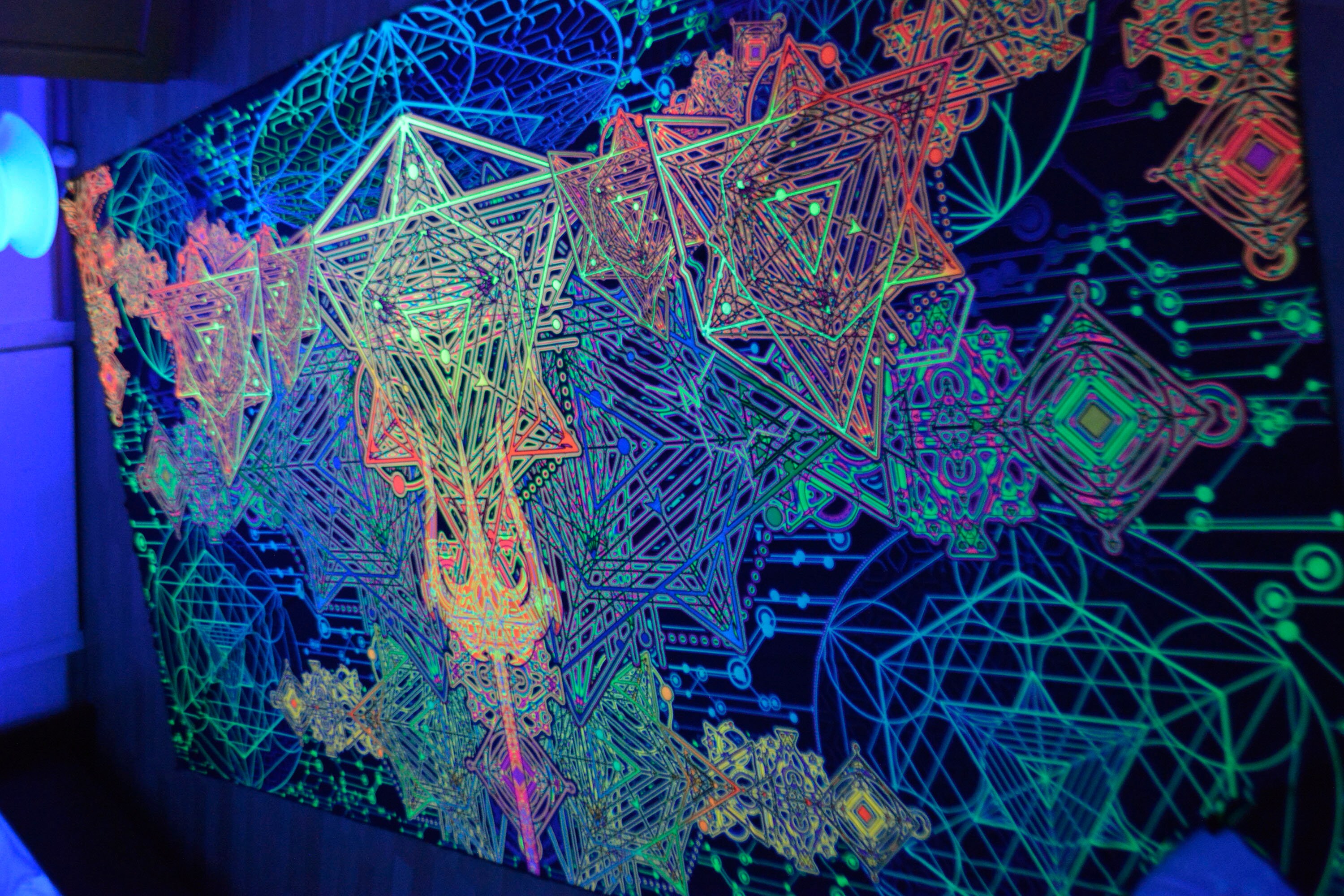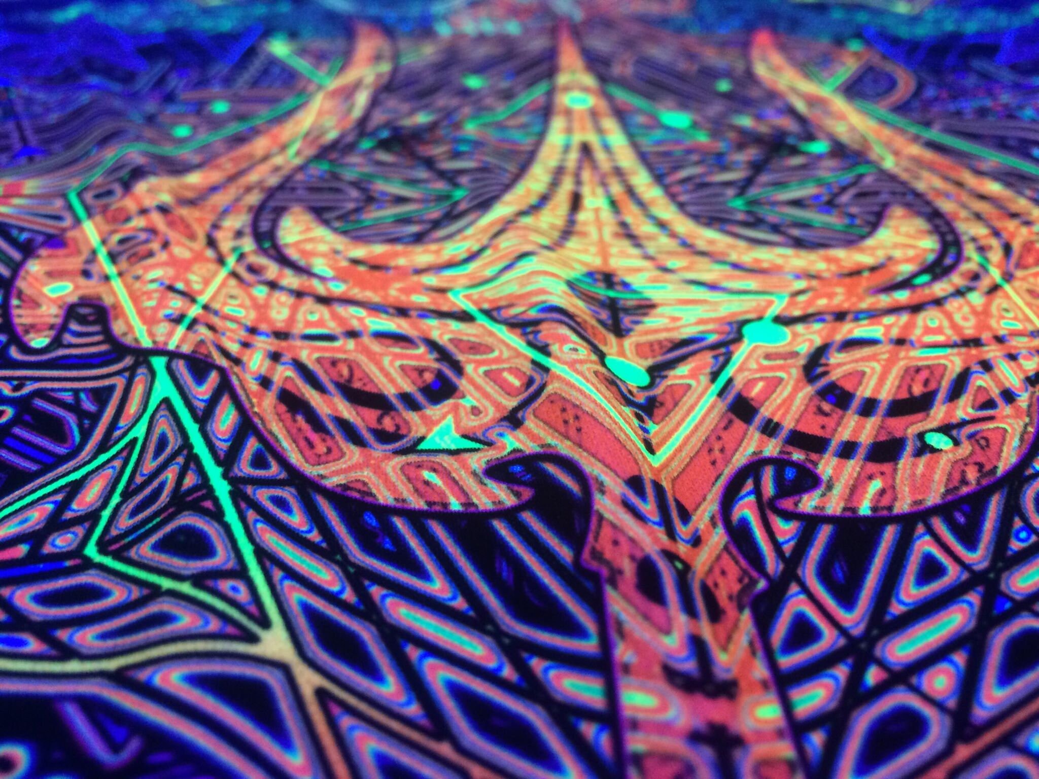 UV Psychedelic Ceiling Decoration – Trishul – Fluorescent canopy design Blacklight Lycra Glow Psytrance Party Festival art