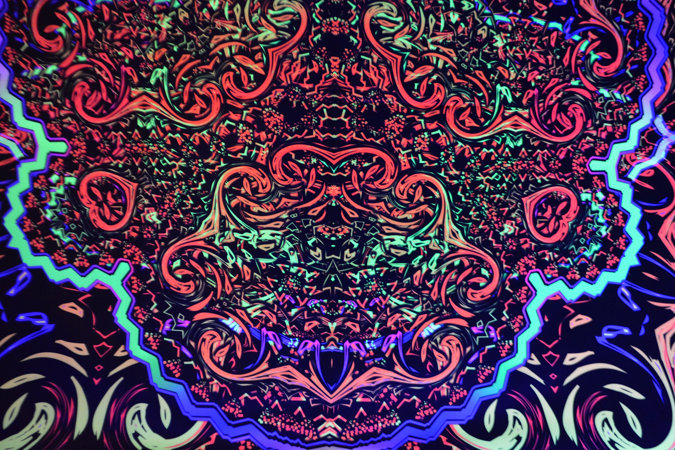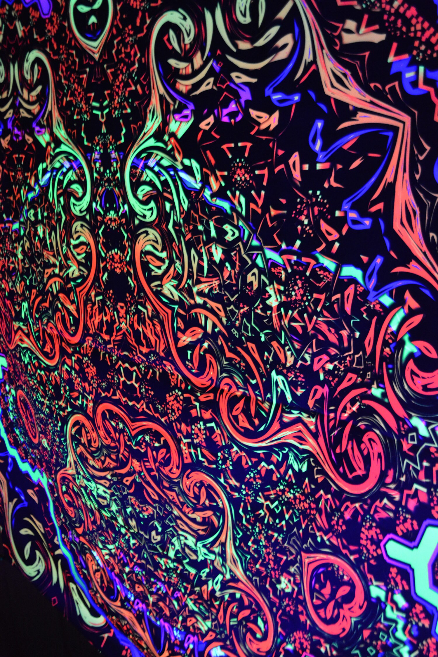UV reactive backdrop tapestry, psychedelic poster, sacred geometry, meditation room, visionary art, neon light psytrance party