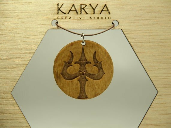 It was made from 3mm birch plywood which has been varnished to prevent it from staining on skin and protects it from humidity. It is very light and easy to wear. It has the Shiva’s trishul symbol laser etched on it.
