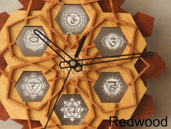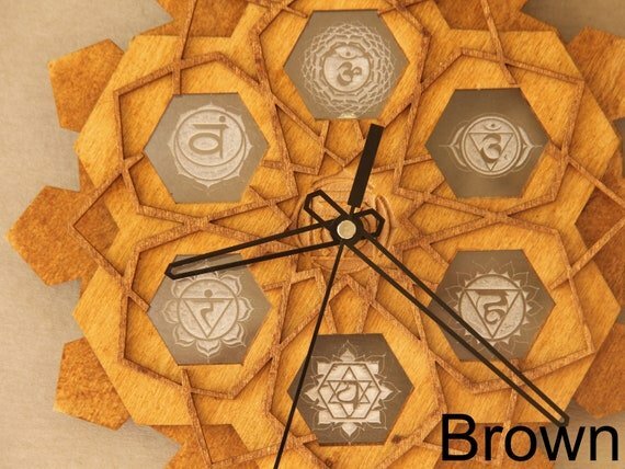 This clock has 3 layers of 3mm birch plywood which has been stained on different brown shades in order to highlight the complexity of the design and one layer of plexiglass which has been laser etched with different symbols of 7 Chakras.
