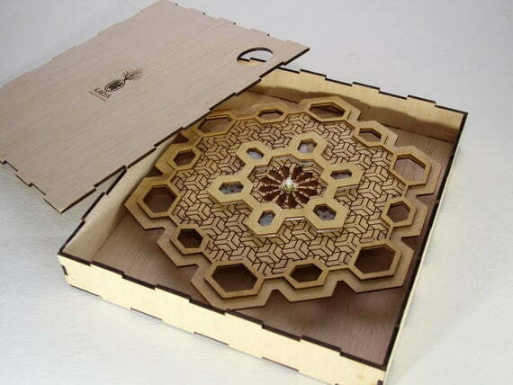 Wooden, multilayered laser cut wall clock with sacred geometry patterns and quiet quartz clock mechanism.